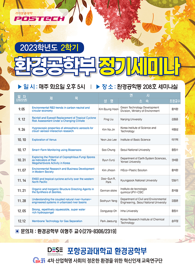 2023-2학기 환경공학부 정기 세미나 작성일 25-11-24 00:41 페이지 정보 일시 매주 화요일 17시 ~ 18시 15분 발표자 문의 279-8303 / dese@postech.ac.kr 본문 목록 이전글2023-2학기 환경공학부 정기 세미나 25.11.24 다음글2023-1학기 환경공학부 정기 세미나 25.11.24 댓글 0 댓글목록 등록된 댓글이 없습니다.