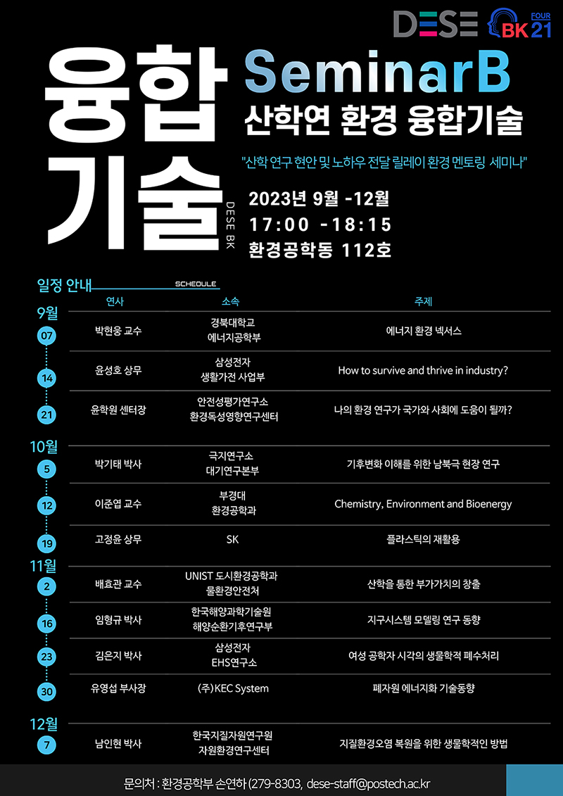 2023-2학기 환경공학부 정기 세미나 작성일 25-11-24 00:42 페이지 정보 일시 매주 화요일 17시 ~ 18시 15분 발표자 문의 279-8303 / dese@postech.ac.kr 본문 목록 이전글2024-1학기 환경공학부 정기 세미나 25.11.24 다음글2023-2학기 환경공학부 정기 세미나 25.11.24 댓글 0 댓글목록 등록된 댓글이 없습니다.