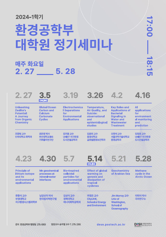 2024-1학기 환경공학부 정기 세미나 작성일 25-11-24 00:43 페이지 정보 일시 매주 화요일 17시 ~ 18시 15분 발표자 문의 279-8303 / dese@postech.ac.kr 본문 목록 이전글2024-2학기 환경공학부 정기 세미나 25.11.24 다음글2023-2학기 환경공학부 정기 세미나 25.11.24 댓글 0 댓글목록 등록된 댓글이 없습니다.