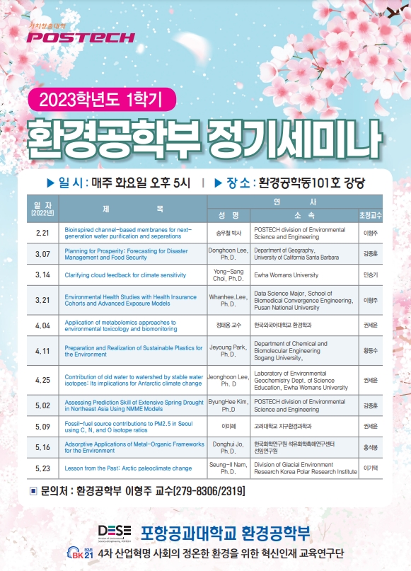 2023-1학기 환경공학부 정기 세미나 작성일 25-11-24 00:41 페이지 정보 일시 매주 화요일 17시 ~ 18시 15분 발표자 문의 279-8303 / dese@postech.ac.kr 본문 목록 이전글2023-2학기 환경공학부 정기 세미나 25.11.24 다음글2022-2학기 환경공학부 정기 세미나 25.11.24 댓글 0 댓글목록 등록된 댓글이 없습니다.