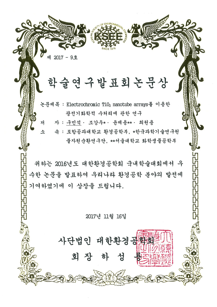 환경공학부 구민석(지도교수: 최원용) 박사과정 학생이 2017년 11월 15일(수)~17일(금) 제주컨벤션센터에서 개최된 2016년도 대한환경공학회 국내학술대회에서 논문상 수상하였습니다.