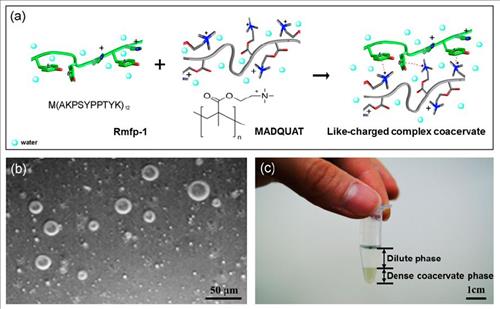 연구진은 또 홍합에서 유래한 접착단백질 양이온과 다른 고분자물질(폴리트리메틸암모늄) 양이온을 사용, 두 단백질이 양이온-π 상호작용에 의해 결합하면서 복합 코아세르베이트를 형성하는 것을 확인했다.