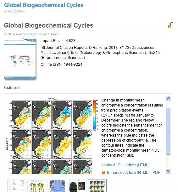 이기택 교수님 연구실 졸업생인 김태욱 박사의 논문이 GLOBAL BIOGEOCHEMICAL CYCLES에 주요논문으로 소개되었습니다. 강수가 해양생산성에 미치는 영향을 연구한 논문으로 자세한 사항은 아래에서 보실 수 있습니다.