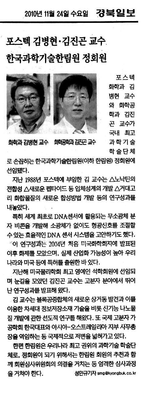 POSTECH(포항공과대학교) 화학과 김병현 교수와 화학공학과/환경공학부 김진곤 교수가 국내 최고 과학기술 학술단체로 손꼽히는 한국과학기술한림원(이하 한림원) 정회원에 선임됐다. 김병현 교수는 지난 88년 POSTECH에 부임해 △노낙틴의 전합성 △새로운 펩타이드 등 입체성계의 개발 △거대고리 화합물질의 새로운 합성방법 개발 등의 연구성과를 내놓았으며 , DNA센서에 활용되는 무소광체 분자 비콘을 세계 최초로 개발해 소광체가 없이도 형광신호를 조절할 수 있는 효율적인 DNA 센서 시스템을 고안하기도 했다. 이 성과는 2004년 처음 미국화학회지에 발표된 이래 화제를 모았으며 실제 산업화 가능성이 높아 우리나라와 미국 등에 특허를 출원한 바 있다. 지난해 미국물리학회 최고 영예인 석학회원에 선임되며 눈길을 모았던 김진곤 교수는 고분자 분야에서 특히 뛰어난 연구성과를 발표해 왔다. 또 김 교수는 블록공중합체의 새로운 상거동 발견과 이것을 이용한 차세대 정보저장소재 기술을 비롯한 신기능 나노물질 개발에 관한 선도적 연구를 해왔으며, 국제 고분자 가공학회 한국대표, 동 학회의 아시아-오스트레일리아 지부 사무총장을 역임하는 등 국제적으로 저변을 넓혀가고 있다. 한림원은 우리나라 최고 권위의 과학기술 학술단체로, 정회원이 되기 위해서는 한림원 회원의 추천과 함께 회원심사위원회의 의결을 거치는 등 엄격한 심사과정을 거쳐야 한다. 2010년 현재 470명의 석학들이 한림원의 정회원으로 가입되어 있으며, POSTECH에서는 22명의 교수(정년퇴직자 포함)가 정회원으로 활동하고 있다.